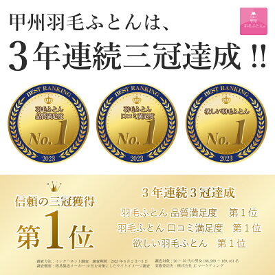 甲州羽毛ふとんは、三冠達成!!(※日本トレンドリサーチ調べ) ・羽毛ふとん品質満足度No.1 ・羽毛ふとん口コミ満足度No.1 ・欲しい羽毛ふとんNo.1 世界遺産「富士山」の麓で作られた高級羽毛合い掛け掛けふとんです。