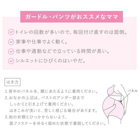ベルトとボトムが一体になったはきこみタイプなので、着くずれ・ズレあがりを気にせず、着脱もラクちん!ベルトは面ファスナーで調節できるので、おなかの変化に合わせて妊娠初期から出産まで着用いただけます。