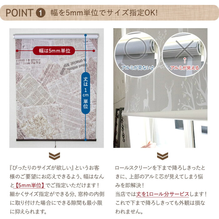こだわる方も満足いく選べる仕様 ---------------------------------------------- 1.サイズオーダー可能 ちょっとした隙間から入ってくる外の光をギリギリまで遮断できるように、幅は5mm単位でサイズオーダーが可能です。