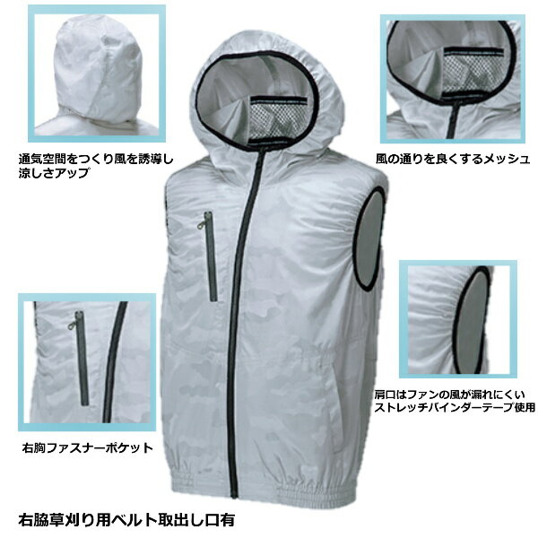 クロダルマ空調ウエア服 素材:ポリエステル100%(迷彩柄エンボス加工) サイズ:S.M.L.LL.3L.4L.5L カラー:迷彩シルバー、迷彩チャコール 型式:26864 現場と現場で働く人の気持ちを知り尽くしたプロ仕様! 帽子の上から被れるアウトフードと草刈り用ベルト取り出し口を装備。