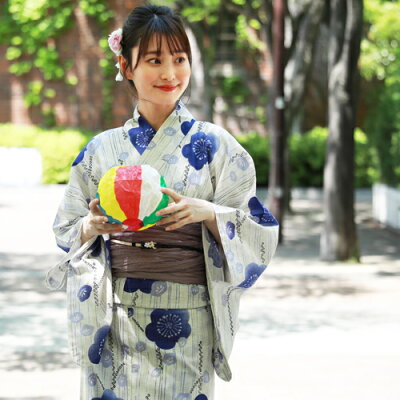 新作浴衣単品花火大会・夏祭り・盆踊りなどの今年の夏の楽しいイベントをお気に入りの新しい浴衣で楽しみませんか?生成り地に青紫の縞とレトロ梅が描かれたお柄は上品でレトロなデザイン。